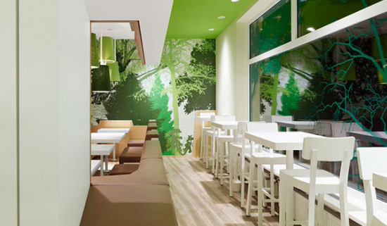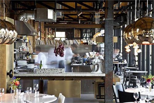位于法国巴黎的库卡(KOOKAI)餐厅,由室内设计师克里斯坦盖沃勒(KRISTAN GAVOILLE)设计。这是一个以材料及色彩为主题的餐厅设计,整个设计充分注意到人在餐饮环境中的心理特征,并利用空间组织手段来表达出某种设计意念,如通过空间形态、灯光、色彩、植物、以及餐具等元素来渲染这个主题。这样的主题无须过分修饰已别具特色。整个空间流畅简练,点缀的绿色植物,显得洁净而富有生气。有活力的色彩似乎让人感觉到一种童年般的梦幻。顶棚上安装了许多不锈钢管道和机械式风口,不作粉饰,在近似的结构空间内塑造出变化的环境气氛,具有强烈的时代感。由此而构成空间的节奏、序列及韵律,产生出美感。进而引起情感、意境及主题的内涵体验。