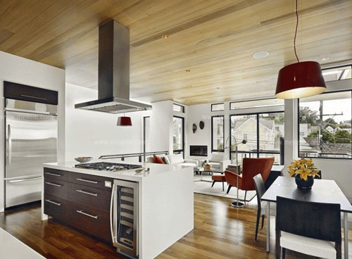 一般家庭餐厅的顶部都是使用的吊顶,这样既美观而又十分亲切,可是设计师需要注意的是,不管是做天花板还是吊顶,一定要以素雅、洁净的材料做装饰。
