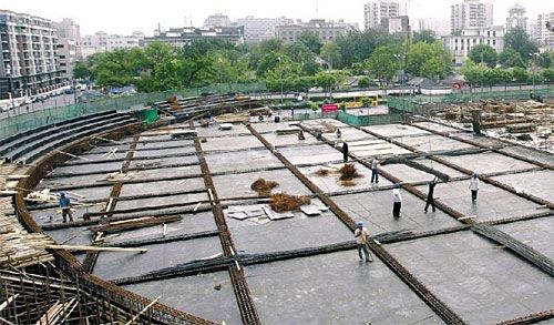 位于金融街的北京市第八中学内,一座标准的体育场预计将于下个月完成水泥浇注。而这座体育场的特殊之处在于,它被建在了距离地面5.2米的高空中。