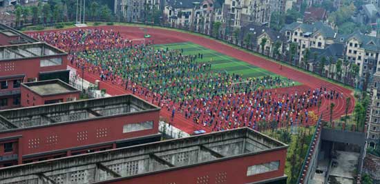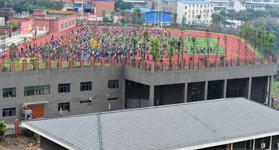 11月18日,重庆渝北学生在“空中操场”做课间操。近日,各地一些学校“空中操场”再度引发关注,一些家长还是担忧孩子在学校的安全。