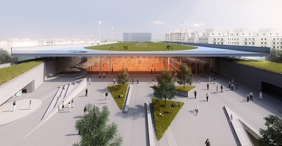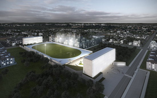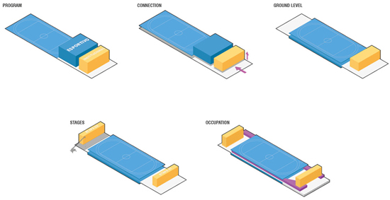 这是巴西卡诺阿斯UFCSPA校园的竞赛方案,建筑师给这个被城市包围,用地紧张的校园设置了一个漂浮的空中足球场??罩凶闱虺∠旅娴目占湓蜃魑呵虺∫约捌渌酆嫌猛?。这样处理有效的解决了人口密度所引发的矛盾。两栋方体教学楼立于足球场的两端,位于入口位置的教学楼被悬挑起来,下方的空间用作学校入口通道。学校也因此有了一个雄伟壮丽的校门---巨大的教学楼。