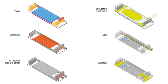 通常情况下,“前面与后面”,“公共与服务”这样的概念是相互矛盾不可并置。建筑师的策略有效发挥出了场地的可能性。选择钢混建筑结构体系有效的缩短了建设周期。此外学校是分期进行建设,建筑师为了避免后期的建设影响已经使用的建筑,将学校人流和建设流线进行分流。