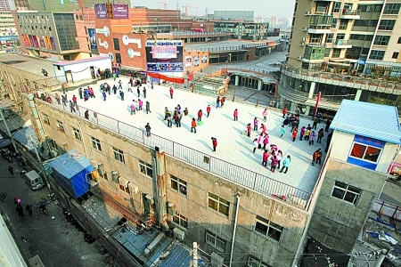 在郑州市姚寨路城中村内,外来务工人员子弟小学——春笋学校的600多名孩子成为这个空中操场的小主人。