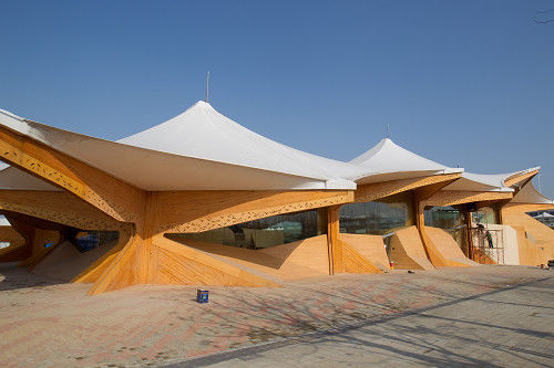 对此,他们找到了满意的解决方案——木板。展馆的外表层受到传统民间剪纸艺术启发的独特设计,选用浸渍激光切割胶合板,安装在一块一块的胶合板建筑模块上。然后再在模块的表面装上玻璃、聚碳酸酯,以及防水或防紫外线辐射的材料,构成墙体。在展馆内部,还要安装半透明的PCV或高密度聚乙烯合成纸的材料薄膜,再安装展馆的外部材料。展馆外部、入口处的地面和展馆内部都覆盖着一层浸渍木地板(俗称强化地板,经热压、成型的地板)。