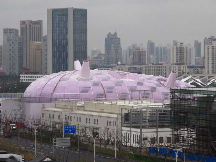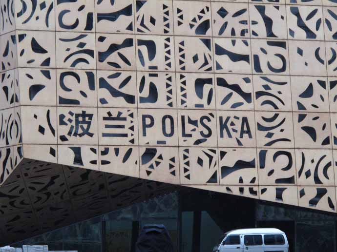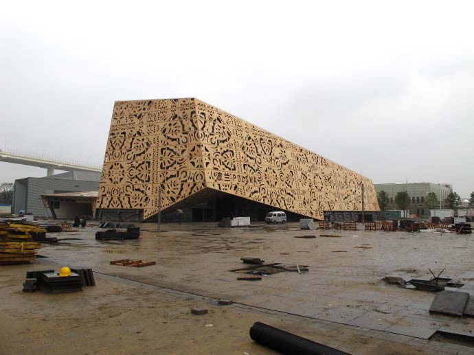 波兰馆建成后的外观如之前的效果图一样,室内却让我有些失望。建筑原来是个封闭的混凝土盒子,原本外立面上富有地域色彩的花纹孔洞其实不是采光的目的,装饰而已,甚至绚烂的夜景也只是在表皮上作的文章。