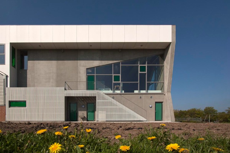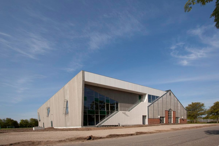 从外面看,这个场馆拥有粗糙的混凝土表皮,大型倾斜式窗户和楼梯让建筑立面显得通透、灵动。