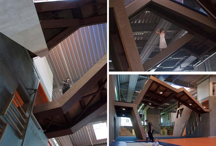通过延伸创造出来的特殊空间也被灵活使用起来。例如,现有场馆的倾斜屋顶被打造成一堵室内攀爬墙使用。