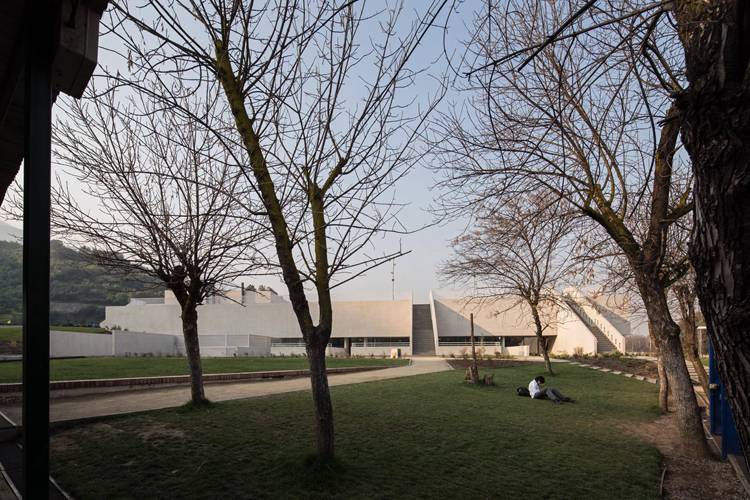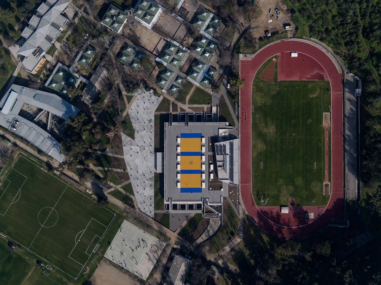 设计的第一考虑要素是将设计融入校园的主风格之中,并且不破坏山的景致。为此,设计将大部分建筑埋入地下,使建筑的最大高度与原有校园建筑的屋顶保持一致。第二个构想是创造一个能够举办室内室外体育活动的建筑。为此,设计了一个巨大的屋顶(第五立面)来提供户外场地,同时更替了旧的露天平台。