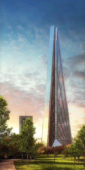 2、“福斯特建筑事务所”为莫斯科设计的“俄罗斯塔”(Russia Tower)——一座楔形的建筑物,由于开发商缺少资金,这幢建筑在去年接近2,000英尺的高度时被取消。