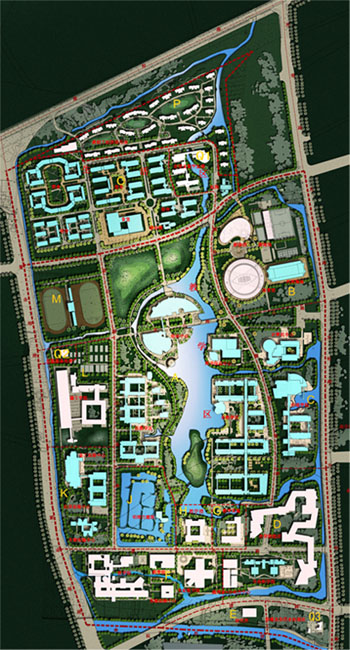 在总体构图上打破了传统的强调对称轴线、两侧均衡布置、端部视觉中心(标志性建筑)收头的布局理念,强调人与自然的统一和谐,围绕中央生态带组织校园空间。在空间特征的营造上摒弃简单的、二维的几何大构图的手法,以院落空间为主题,突出院落的空间规划,通过创造复合空间给人以多样化的空间感受。并以院落为核心来协调建筑、道路、空间、植物、水体、小品等诸元素,组成大小不等、层次分明的几十个"园"的空间,进而由小园组合成大园,大园组合成校园。