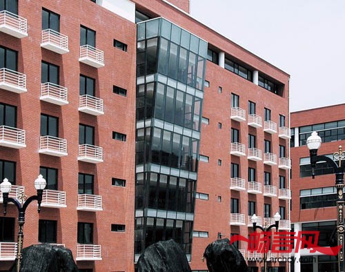 (2)功能分区要根据校园内部的功能要求、用地条件和周边道路及环境状况来决定。国内的校园大都是封闭管理的,其功能分区往往需要与校门的设置一起考虑,也会受到周边道路的制约。在可能的条件下,也要充分考虑国人的文化心理习惯,比如主校门应朝南或朝东布置,使校门内的主要建筑群阳光充沛。