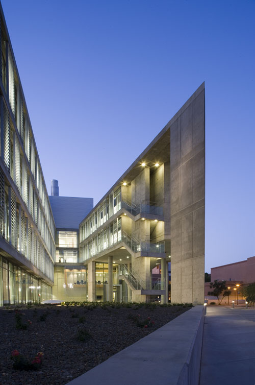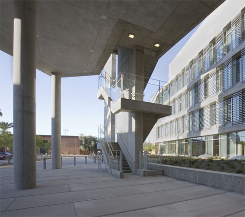 为了减少西晒效应,建筑西立面实体性较强。沿建筑西侧布置的功能空间主要是一些实验室辅助空间和一些不常用的建筑空间。设计师结合当地干旱的沙漠气候条件,将一些疏散楼梯设计在室外,为建筑形象增添了活力。通往邻近主入口的办公室翼楼的疏散楼梯设计尤其让人印象深刻。这些设计元素与支撑办公楼屋顶的4层高的斜面混凝土柱共同作用,更加突出了广场和建筑入口。
