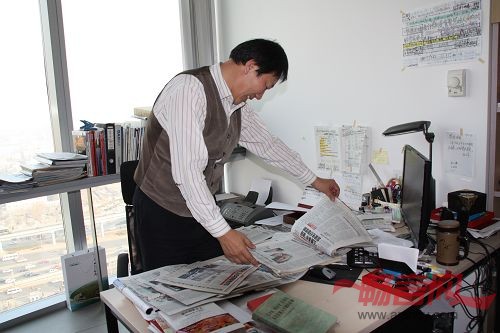 与普通员工一起上班,一进办公室就先看当日主要报纸,不只是关注建筑版面,而是积极了解时事,边看报纸边做笔记,并将自己认为重要的新闻用笔都划出来,有些甚至还要将自己的感想付之笔端,在报纸上写下自己的见解?!侗本┣嗄瓯ā返纳缏郯媸前琢殖W雠⒌陌婷?。