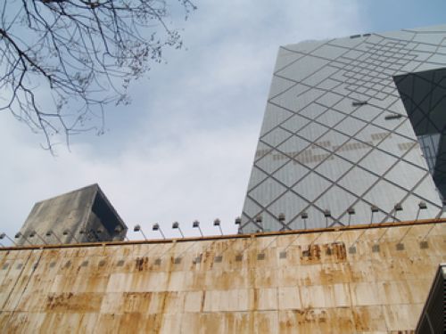 从三环国贸桥望去,配楼主体间泛出一片“新绿”,面积不大,却十分显眼。虽未见施工人员,但围挡附近的墙体相较其他部分显然增白了不少。朝阳路上央视新址工地的北门外,保安拒绝任何无证人员进入。出入工地的几名知情工人表示,配楼准备进行翻新,将拆除被烧毁的部分,重新修建外立面。央视新址主楼建设方中建总公司的一名工作人员称,配楼的外立面修复工程至少要半年才能完成。