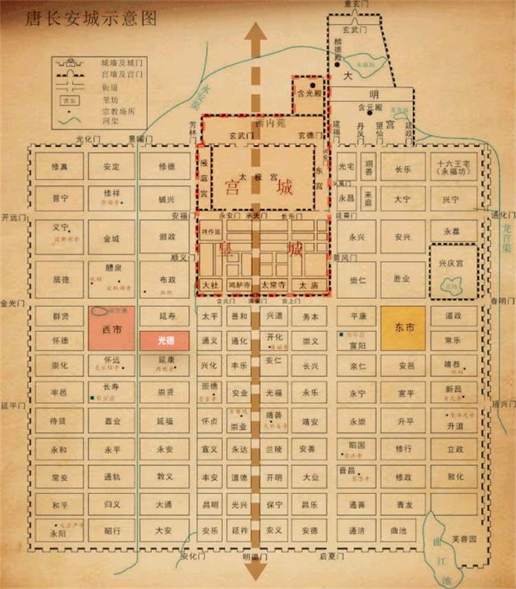 唐长安城总体上是中轴对称的格局,中轴线北端为宫城,处于首位,象征着王室的权威,中部以及东西两侧为市(大致上靠近中心地带)。朱雀街以西主要是一般百姓和富商等形形色色人物的聚居地。官吏和贵族住宅主要集中在朱雀街以东。也就是一般所说的“东贵西富”。