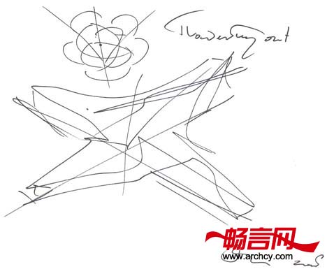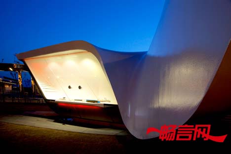 400荷兰馆的外形设计也揭示了它的功能,建筑的中心地区是一个有更加持久功能、封闭的功能区域。与中心区域相反,几个花瓣式的部分逐渐向周围景观扩散而去,而且越往外,每个“花瓣”就显得更具有流动性。每个“花瓣”及其开口(窗户)都朝着不同的方向,而且每个“花瓣”在整个场馆里的功能都不同。此外,连续、流动式的外观仿若模糊了“花瓣”的室内与室外区域的界限,这样就使建筑与景观融合起来。