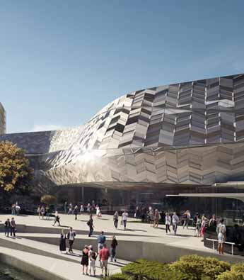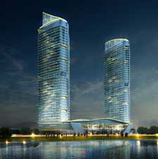 国际会议中心通过配备外遮阳磨砂玻璃来增加建筑的层次,会议中心南边的绿地和三叠水景观,又提高了建筑自然采光与通风的有效面积,真正达到冬暖夏凉的效果。