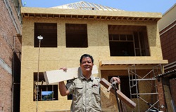 郑中伏说:“3月正式打地基,包括我在内的4个木工参与修建,预计5月底就能全部装完。2层木屋加上楼顶的屋脊,面积约300平方米。预计要用400块长2.4米,宽1.2米的OSP(优化实木)板材。板材间用白乳胶和自攻螺丝相连。较之砖构结构、框架结构,木屋工期至少缩短10个月。”此外,所有外墙板材外部进行防水处理,内部嵌入岩棉保温。因底座无法做防水,郑师傅将木屋底座加高,离地0.5米以防潮。