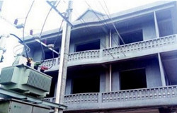 别墅主体已经完工,外墙已经用水泥抹平,底层也已经装好了卷帘门,在别墅的附近有一台变压器,固定变压器的电线杆上印着“10kv李企#1线中心中学直线西李权庄A台分支线#02”字样,变压器顶端有三条带绝缘胶皮的高压线和下层的四条低压线,其中四条低压线被套上白色的塑料管埋在了二层和三层之间的混凝土房梁内,三条高压线则直接从三层窗户穿楼而过。记者在现场并没有发现别墅内有人居住。