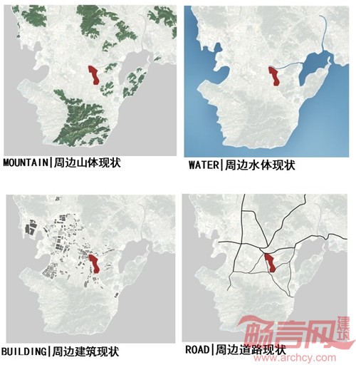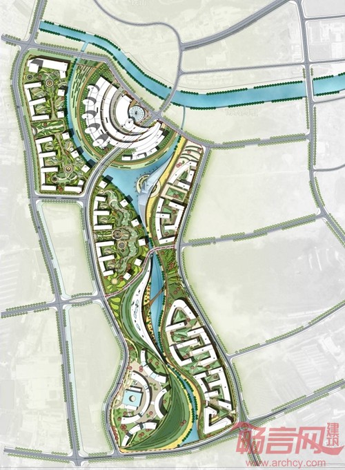 我们将流经基地北侧的水系引入规划,并将其梳理延伸为区域内景观水系,用以提升环境品质,调整园区内微气候,水系河道在多雨季节还可作为收集雨水和循环利用的系统。北部面向河流和老铁山的城市界面被打造成了半月形的研发人员配套商业区,这里也是项目的核心商务区;西部两块地作为研发人员配套公寓区,满足了园内专家与工作人员的居住需求;东部南北贯通的条状带及南部山丘的一部分是项目的核心功能区---系统医疗产业区,它延园内水系铺展开来,营造出非常优质的工作环境。