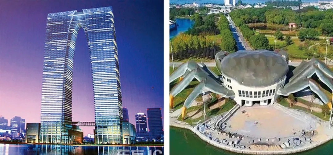 与此同时,“丑陋建筑”作为一个社会性话题却越来越频繁地进入公众视野,间或引爆舆情,甚至酿成颇具影响力的公共事件。从苏州“秋裤楼”(图2)、昆山“螃蟹馆”(图3),一直到近期的广州“大莲花体育场”,都会瞬间刷屏,形成病毒式传播。“丑陋建筑”这一概念开始深入人心:许多建筑尚处于施工阶段甚至还在设计酝酿中,就已被热心网民冠以“丑陋建筑”之名在网上发布,或者直接向“丑陋建筑评选”组委会“举报”。笔者在生活中也时常碰到建筑师以半开玩笑的口吻,说自己的设计万一入围“丑陋建筑评选”,千万要手下留情云云。在某种程度上,“丑陋建筑评选”作为一种公共性的舆论“威慑”力量,已经成为悬在地方政府、甲方、建筑师头上的一柄“达摩克里斯之剑”,使他们在设计和决策建筑方案时不得不心有所忌、行有所惮。典型的案例,就是模仿螃蟹造型的“江苏昆山巴城蟹文化馆”,在2018年底入选“十大丑陋建筑”后不到一年,即被当地政府拆除;而广州“大莲花体育场”,也因舆情汹涌而被迫进行方案调整。无法假设,如果没有“丑陋建筑评选”这副无形的缰辔,中国建筑这匹野马要奔向什么样危险的悬崖。