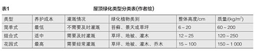 屋顶绿化根据精细程度可分为简单式、组合式及花园式3种类型(表1)。