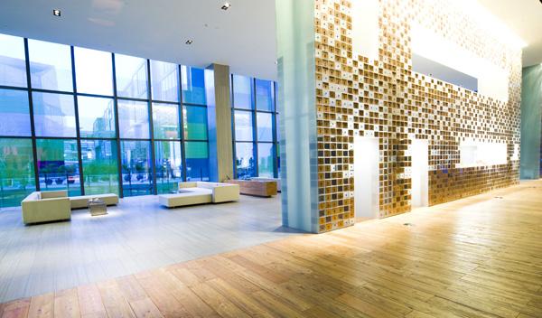 坐落于上海闹市中的Z58,毗邻“国父”孙中山家族的美丽花园,由一幢老办公楼改造而成,前身是上海市手表五厂厂房。在Z58的正立面,镜子般的花栏是隈研吾最擅长的“使建筑消失”,最为精妙的是建筑顶层:一间立于水面上的房间,与周围环境协调融洽。门厅则像是一个被分离的、静谧的室外空间。一侧是沿街的镜子立面,一侧是用条形绿玻璃条做成的肌理效果,玻璃条截面是切角后的正方形。门厅的交通很简洁,一条小径通达办公区和电梯,周围是人工水面。