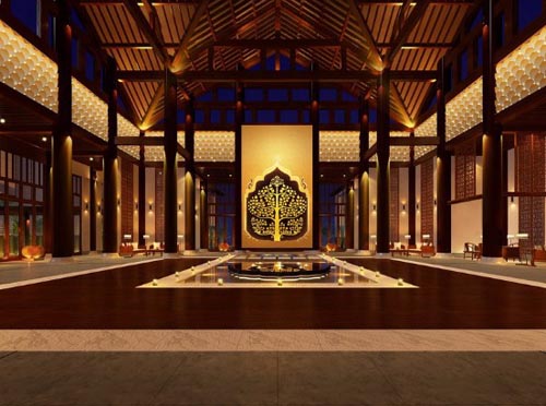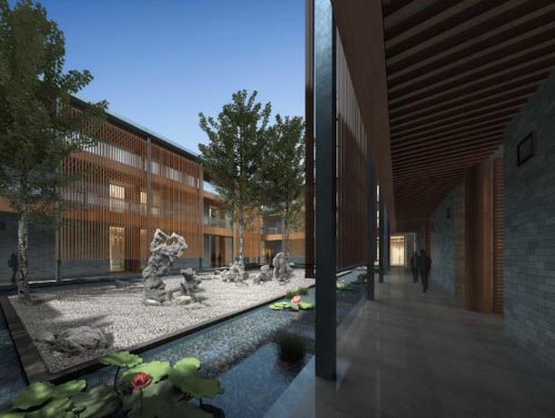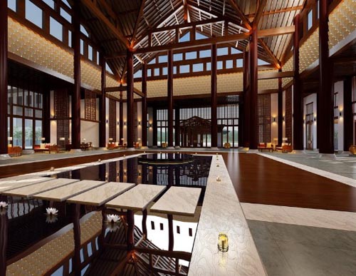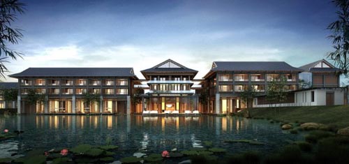 禅泉酒店位于禅宗六祖惠能的故里广东省云浮市新兴县龙山风景区,由五星级度假酒店、精品酒店、天然温泉区和国际会议中心等组成,拥有客房300余间。规划设计充分尊重当地既有的风水与文脉,基地南面的主酒店大堂入口及广场,是六祖明镜广场、坛经楼、龙山国恩寺中轴线的延续。轴线两侧的一泓清澈淡雅 的荷塘成为广场的天然背景。顺着主轴北望,六组园林庭院式建筑组群宁静而大气地分布其间,富有禅意和现代东方韵味。轴线继续向北延伸至露天温泉区和精品酒 店区的自然园林景观,并将视线一直引向远处的群山。这样的空间布局将六祖故里龙山的气场自然地引入基地和建筑,天人合一。精品酒店设计独立而尊贵的出入 口,其会所与主酒店大堂隔湖相望,形成另一条重要的景观轴线和通廊。23套精品客房舒适有致地散落在溪流边、竹林中、明湖畔、草坡上。彰显顶级度假区的档 次。