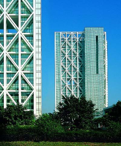 本工程以建筑物围绕着基地形成一个大型向内的隐蔽空间。创造出一个中心花园空间,使大厦群体各组成部分连成一整体。中心花园周围的建筑包含南北两栋办公楼, 东西两栋玻璃裙楼,南北两个联系长廊,中心花园相对规划路抬高两米形成花园平台。两栋高层办公楼为开放型办公室,超薄的体型体使至室内的每一位置均能看到北面江景。该项目是在华南地区首先采用地板送风这一节能空调方式的办公楼。